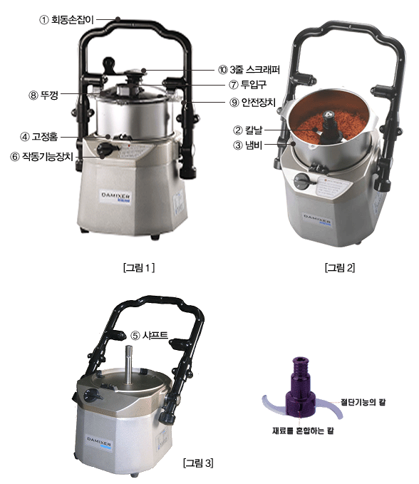 ※ 작동순서의 예) 용기올림 ⇒ 칼날끼우기 ⇒ 재료넣기 ⇒ 뚜껑 ⇒ 안전장치(회동손잡이) ⇒ 작동스위치